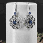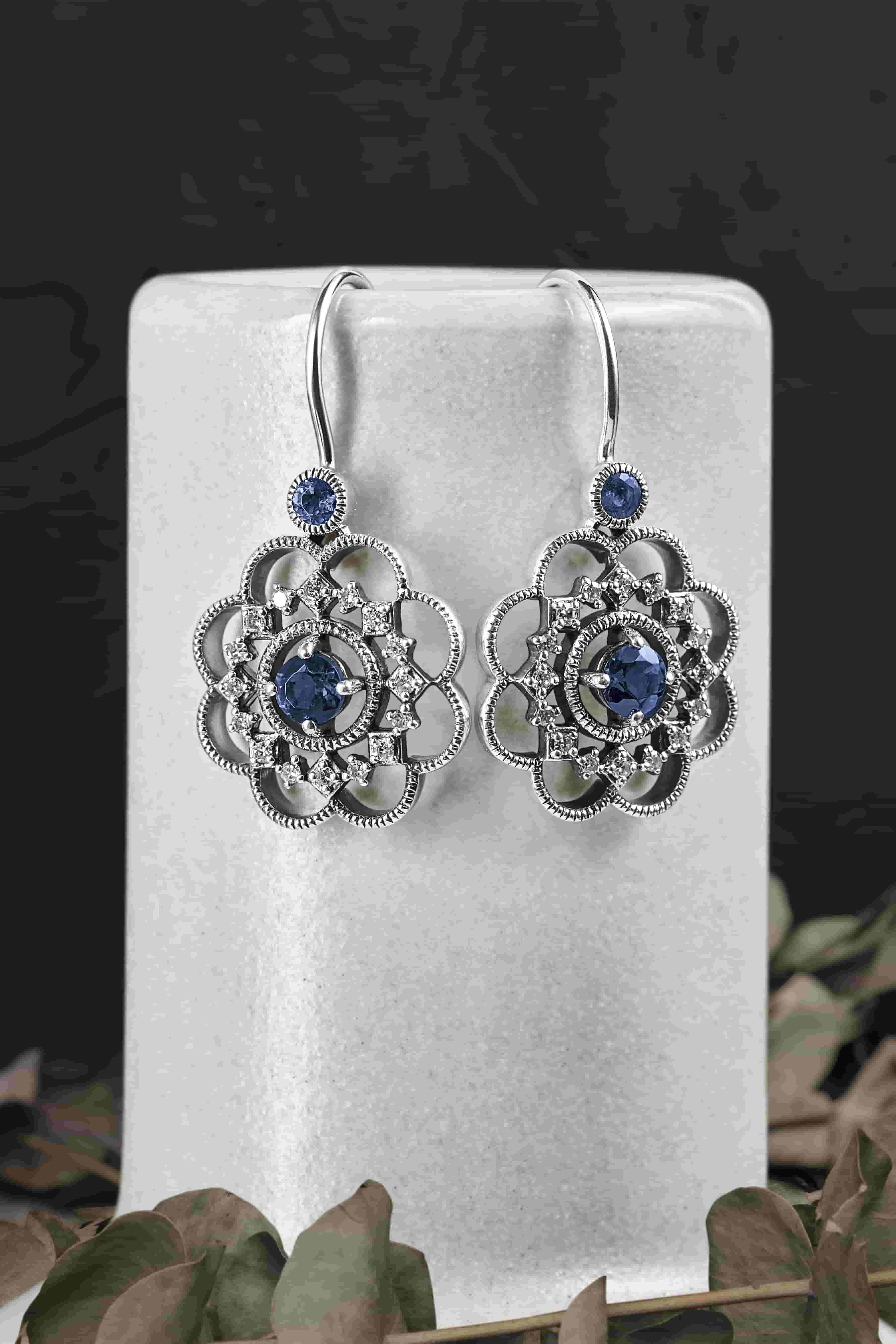 The Whisper Bloom Earrings capture the quiet beauty of a layered floral silhouette, crafted in sterling silver with a white rhodium finish. A lace-like bloom unfolds gently, accented with serene blue topaz/amethyst gemstones that bring a subtle touch of color and calm. A matching gemstone at the hook completes the design, while the airy form sways softly with each movement, symbolising grace, renewal, and lightness in every moment.